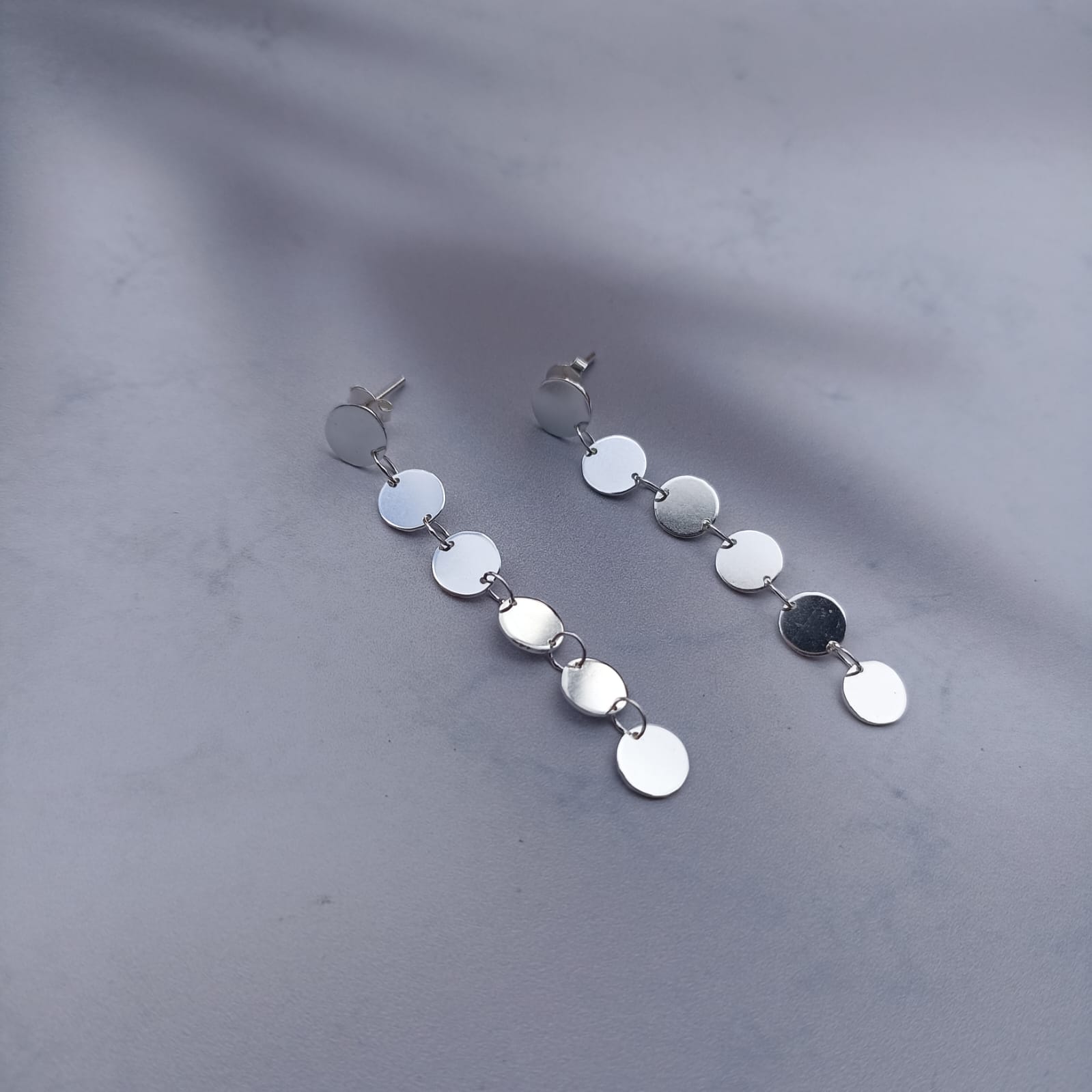 Dimensiones: Seis circulos de 7mm de diametro cada uno y espesor de 0.7 milimetros. Largo aproximado de los aretes de 4.5cm.