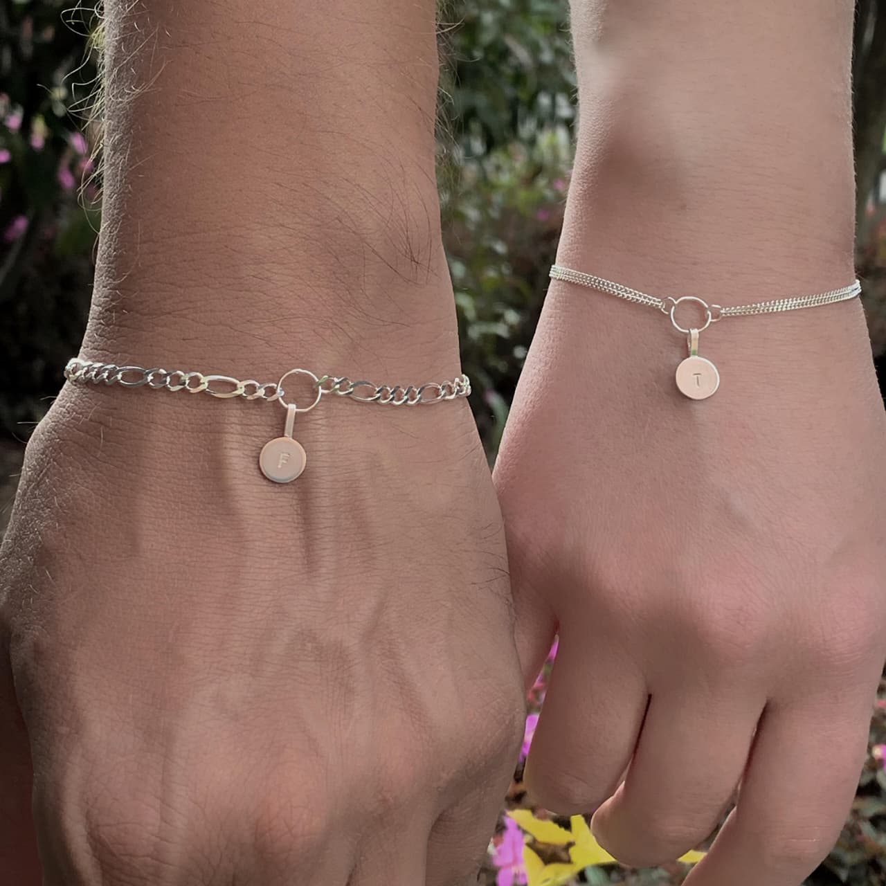 Pulsera hombre unico tejido de cadena con medalla de 7mm de diametro y letra marcada.