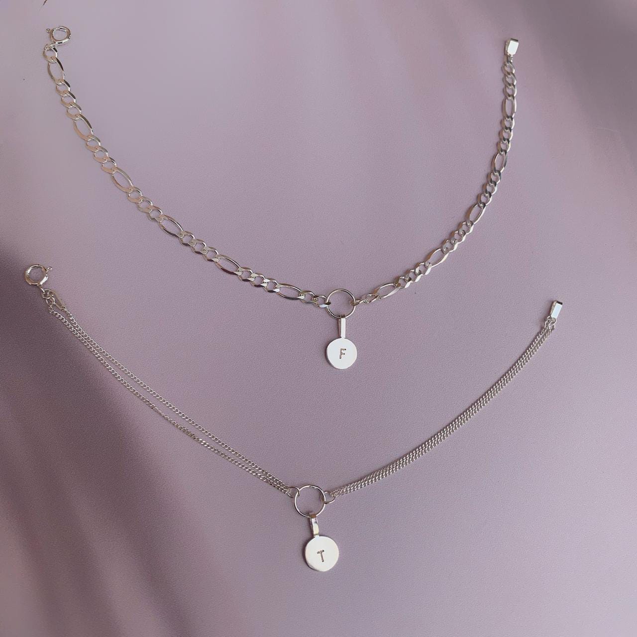 Pulsera mujer de cadena combinada con medalla de 7mm de diametro y letra marcada.
