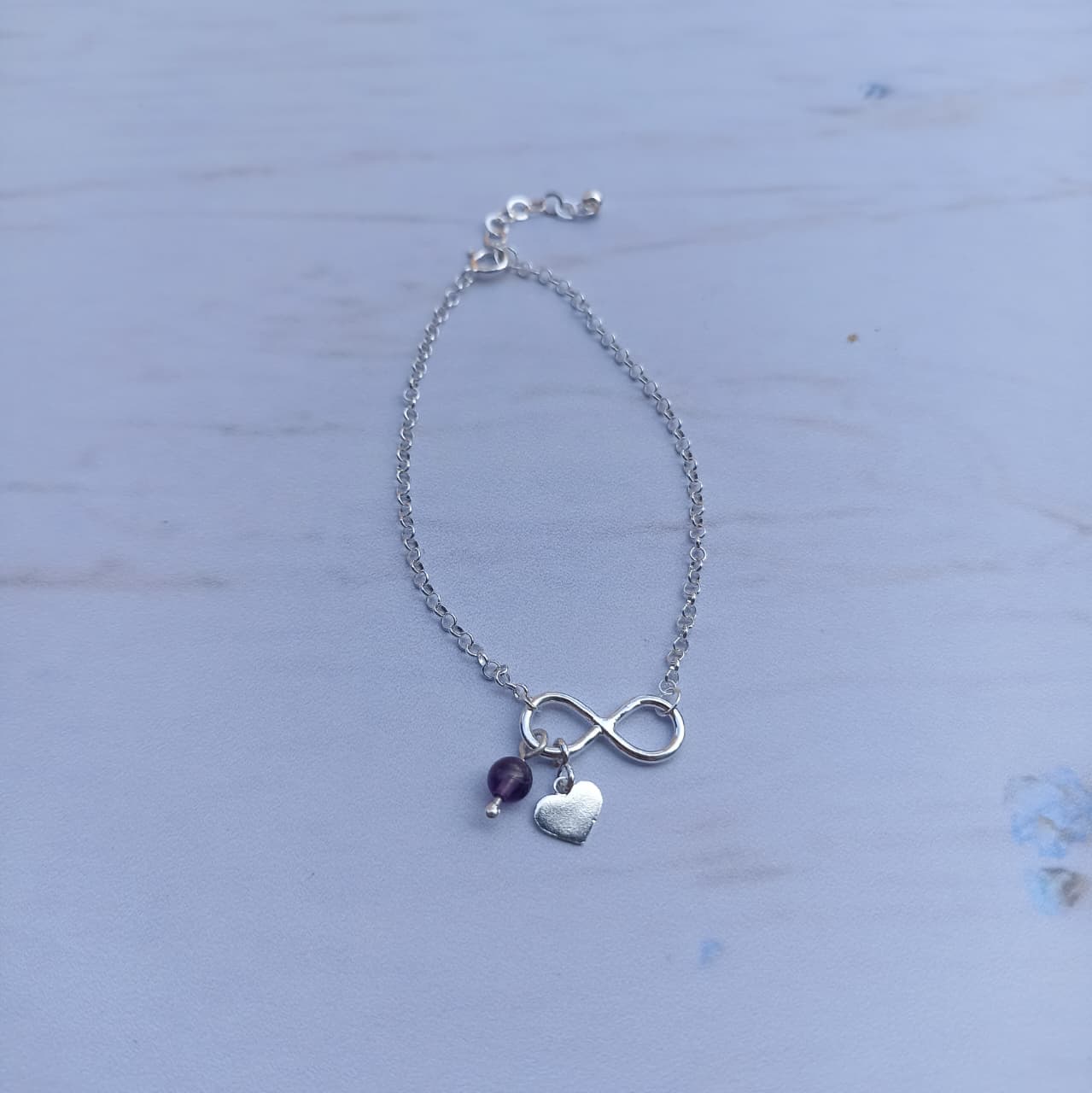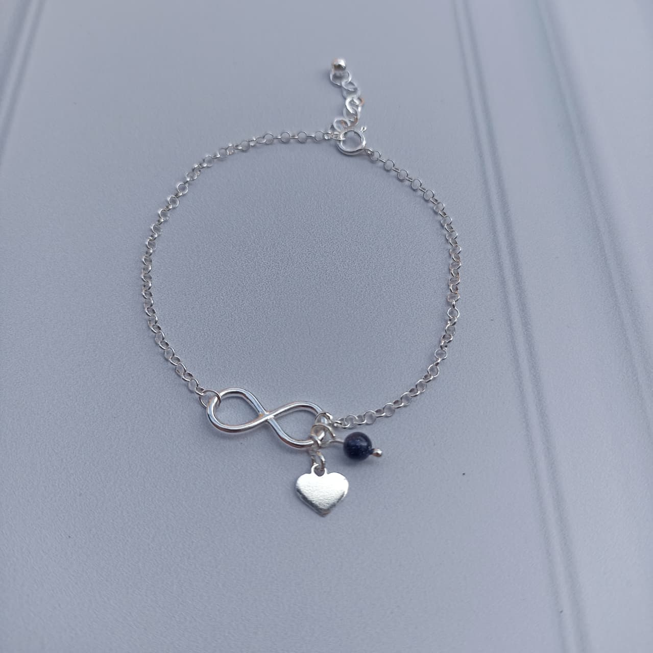 Dimensiones: Cadena eslabón corrido de 16-18cm Largo. Infinito medidas alto 0.5 mm, largo 1.5 cm aproximadamente. Dije de corazón de 5mm de alto.